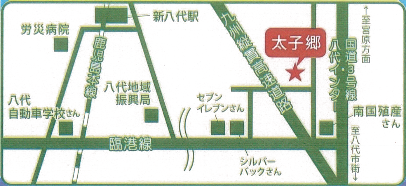 アクセスマップ 八代インターチェンジより 車で 3分 新八代駅より 車で 3分 片野川停留所(バス停)より 徒歩 3分 臨港線の高速道路高架下にある信号交差点を北側に曲がり突き当りを東側に曲がれば、すぐに見えます!